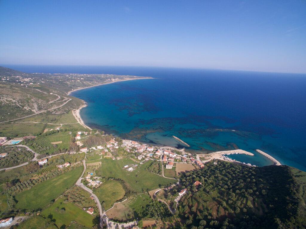 Katelios has gradually grown around the wide bay, and the main beach, Agia Varvara, gives fantastic views across the Ionian sea to the island of Zakynthos and mainland Greece.,
